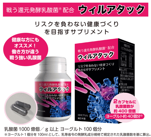 | 還元発酵乳酸菌配合【ウィルアタック(60カプセル入)】 |